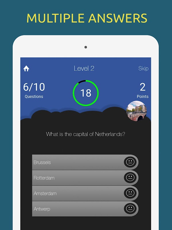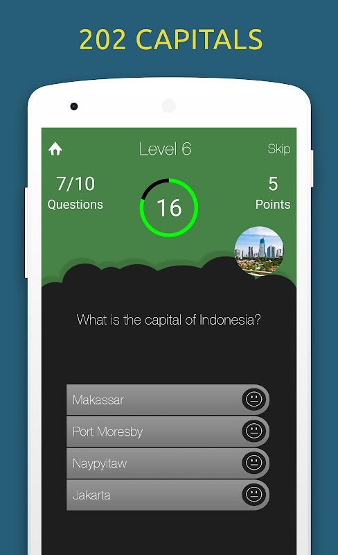 World Capitals Quiz is een effectieve manier om de hoofdsteden van alle landen ter wereld te onthouden. Deze app helpt ook om het algemene bewustzijn over de verschillende landen van de wereld te vergroten. Ontdek hoe vele hoofdsteden die je al kent en leren van de hoofdsteden dat je niet wist.