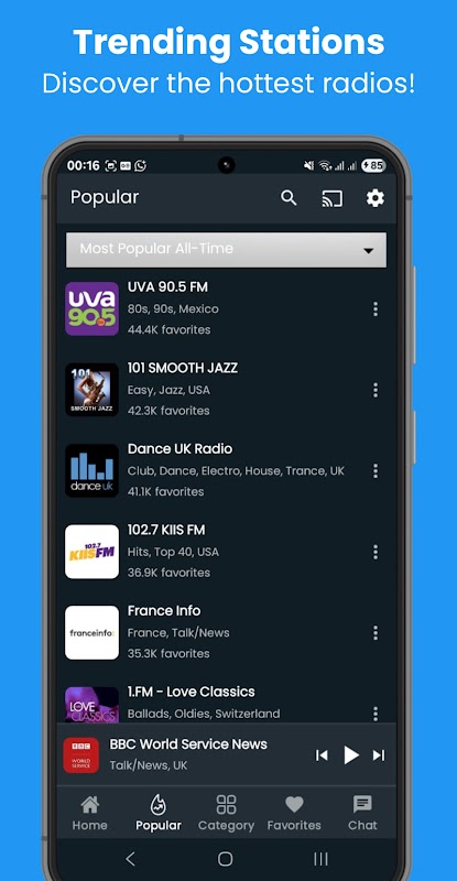 Elk land is vertegenwoordigd, en dagelijks worden nieuwe stations toegevoegd. Tik om direct te luisteren - zonder onderbrekingen.