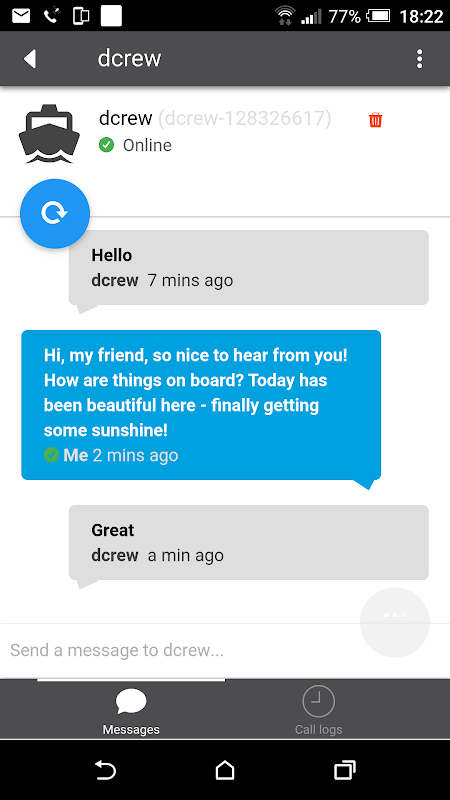 As a seafarer’s family member or friend, enjoy receiving video calls and exchange messages with your loved one at sea. Install the app, establish a data connection via WiFi or GSM, register a unique user account free of charge, accept your contact’s invitation and receive video calls.