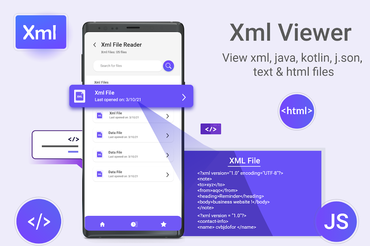 XML-bestandsviewer is een app voor het lezen en bekijken van bestanden voor Android-apparaten. Met Xml Viewer voor Android kunnen gebruikers HTML-, JAVA-, JSON- en TEXT-bestanden openen en bekijken. XML Viewer voor Android is een gebruiksvriendelijke bestandsviewer omdat de gebruikers op elk moment toegang hebben tot alle bestanden op hun apparaat. Xml-viewer is een bestandsopener en -lezer waarmee gebruikers hun XML-bestanden en andere bestanden kunnen beheren. Deze XML-bestandsviewer voor Android helpt u om meer opslagcapaciteit op uw apparaat te creëren. Xml Viewer en Xml Reader plaatsen de Html-, Java-, Json-, Tekst- en Xml-bestanden in hun specifieke mappen. XML-lezer biedt gemakkelijke toegang tot alle bestanden aan de gebruikers zoals ze zijn gerangschikt in hun respectievelijke mappen. Bovendien worden alle bestanden automatisch bijgewerkt in hun mappen. XML Viewer voor Android is een gemakkelijk toegankelijke tool om java- en txt-bestanden in academici te lezen.