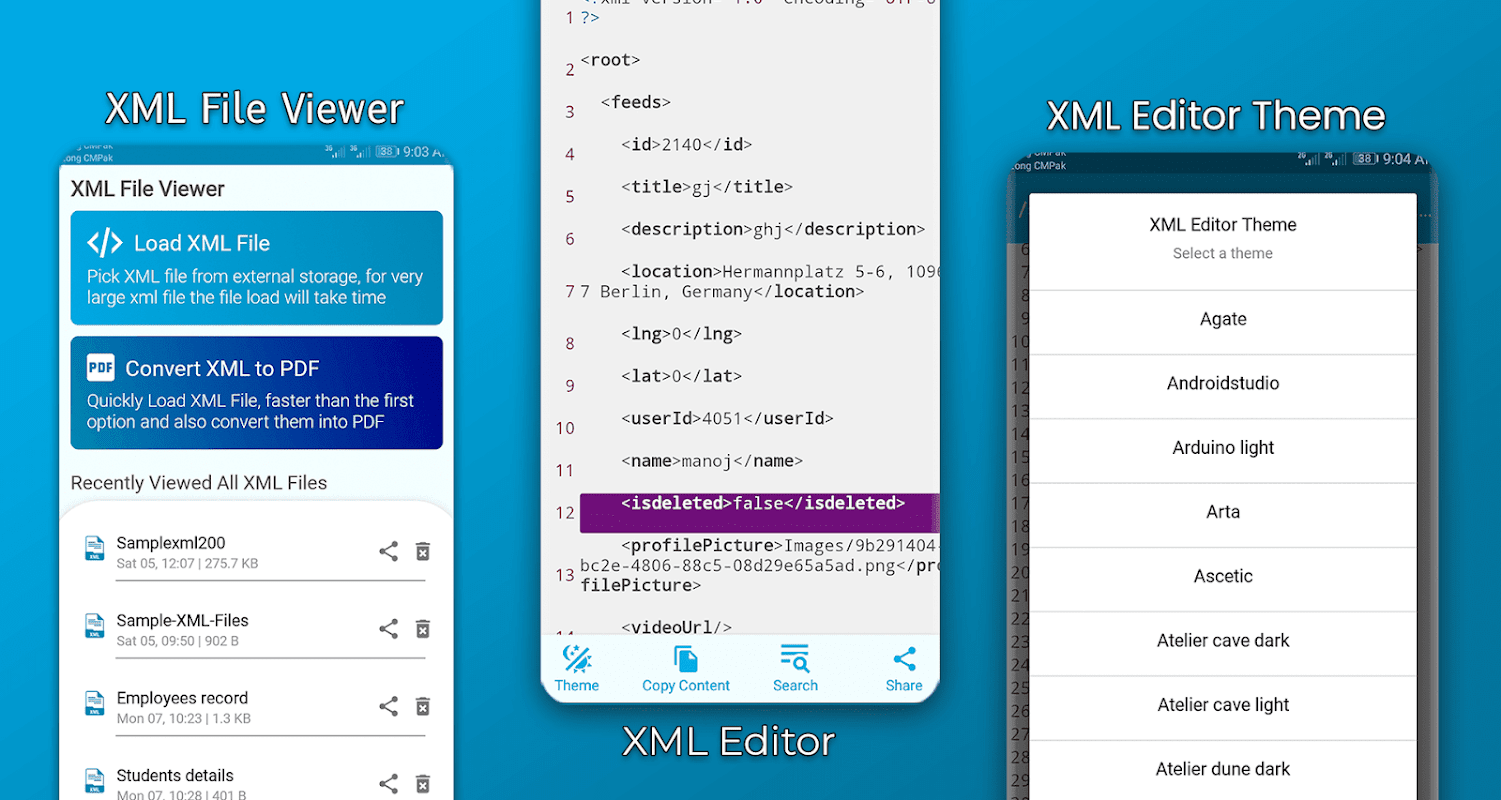 XML Viewer or XML reader have a lot of xml editor theme and choose the theme with which you are more comfortable in order to use xml viewer. Use XML Viewer to view your already saved files. Need to convert xml to pdf or print, xml reader is here to do the conversion work for you.