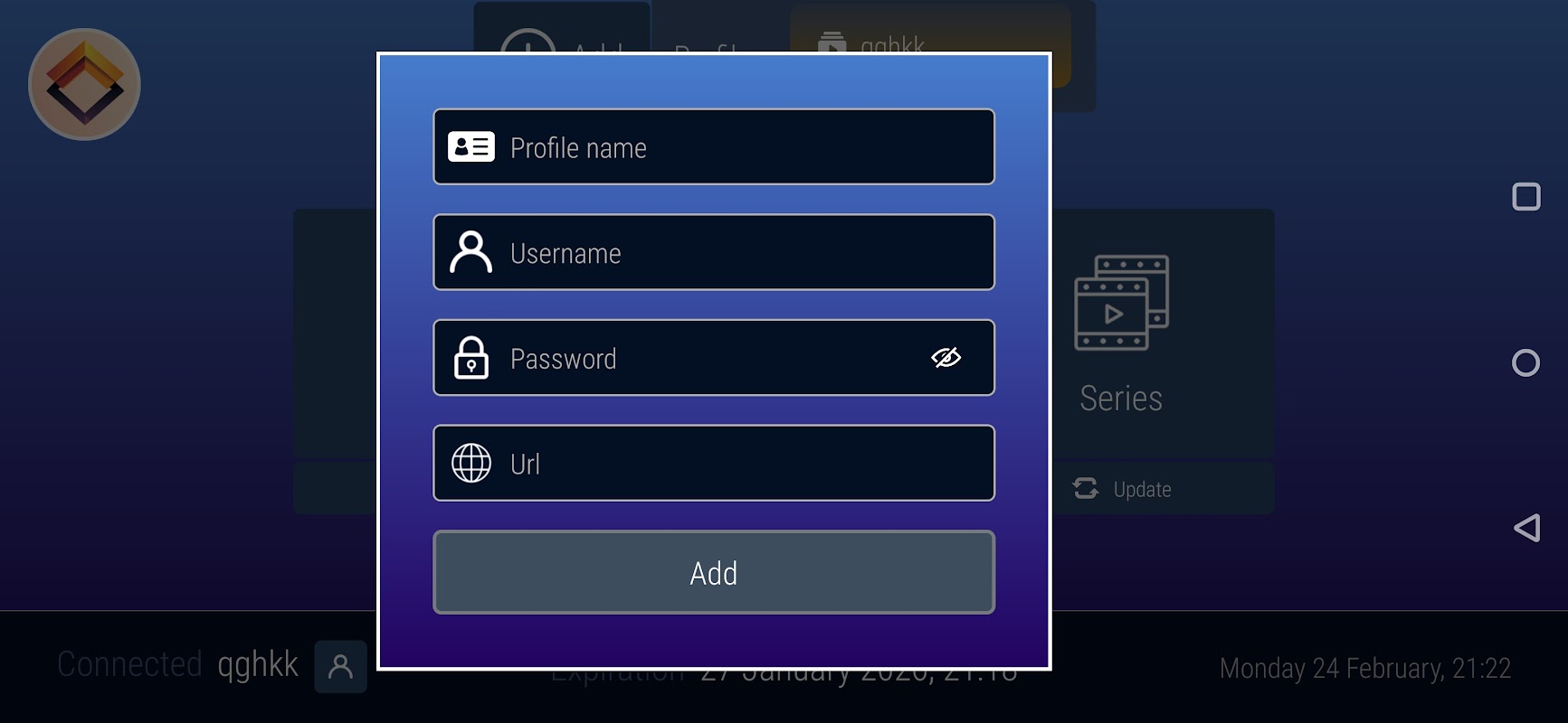 Kijk live tv, films, series met je Xtream-account. Voeg eenvoudig uw profiel toe (gebruikersnaam, wachtwoord en URL) en geniet van de live kanalen en VOD's van uw IPTV-provider.