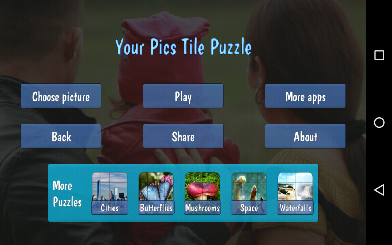 Select the images from your photo gallery and play the tile puzzle with your own pictures!