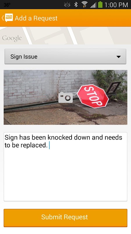 * Google Maps provides a familiar, user-friendly environment. Use your current location; search for a location; perform a Long Press to drop a pin; or simply hold and drag the pin to the issue's location when submitting a request.
