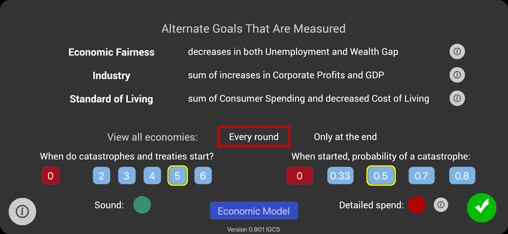 Een valide macro-economisch model ondersteunt het spel, gedreven door de kaartkeuzes van de spelers. Spelers kunnen ook het economische model aanpassen aan hun overtuigingen of voorkeuren.