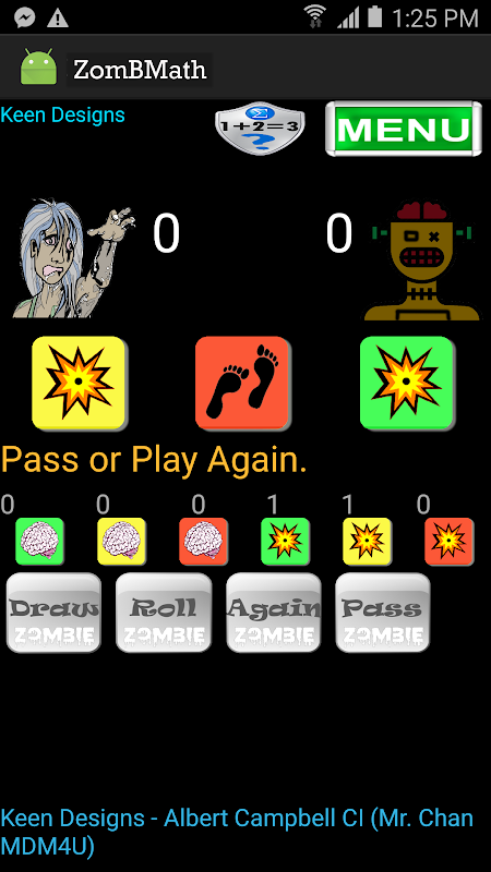 This is a full zombies math game version of dice probabilities. A player can choose to play against a robot zombie, or with another player. Players are racing to score 13 brains and playing in turn. Options for sound effects or changing racing score to win are provided. During a turn, a player draws and rolls 3 dice at a time, and keeps scores of brains and blasts. A player could keep on drawing and rolling dice and accumulate brains scores as long as the blast tally is less than 3, or the player will lose the brains tally and the turn. The player can also stop at any time during the turn to secure the scores. Player could also score bonus points or steal points from opponent by answering mathematical probability challenges (MDM4U level) correctly. Basic probability theories needed for the challenges are outlined in the info section.