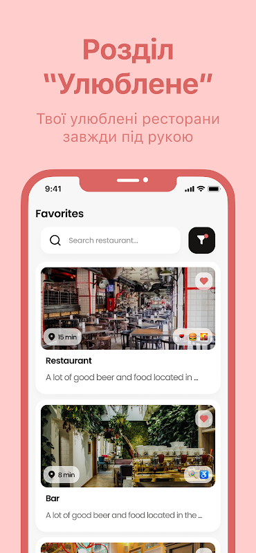 U kunt eenvoudig het gewenste etablissement vinden met behulp van filters op "Categorie", "Keuken", "Locatie" en andere parameters.
