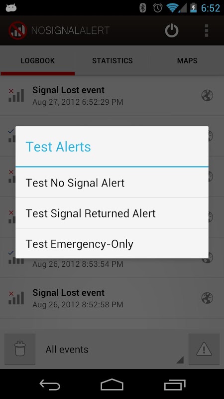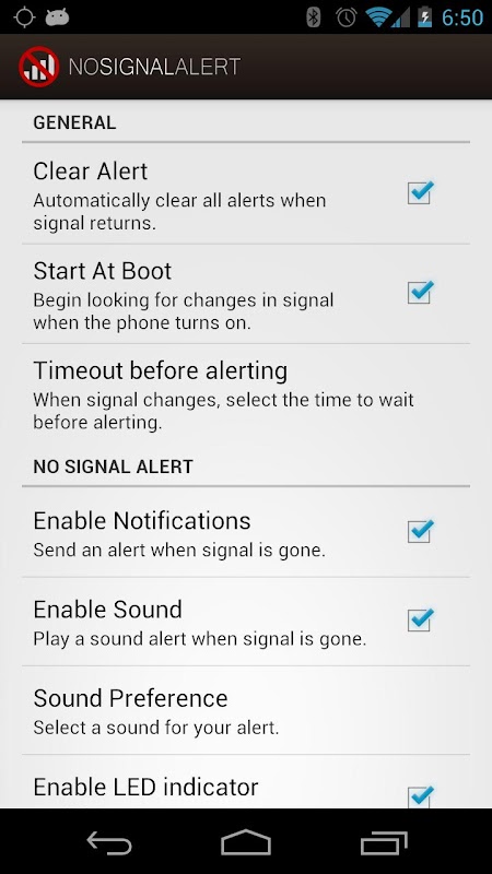 No Signal Alert detects when your phone is in a "dead zone" or with no reception and sends a customized notification of your choice (sound, vibrate, led color indicator, etc). No Signal Alert can keeps track of every time you loose and recover your phone signal, providing users with useful statistics such as time, location and address when signal was lost.