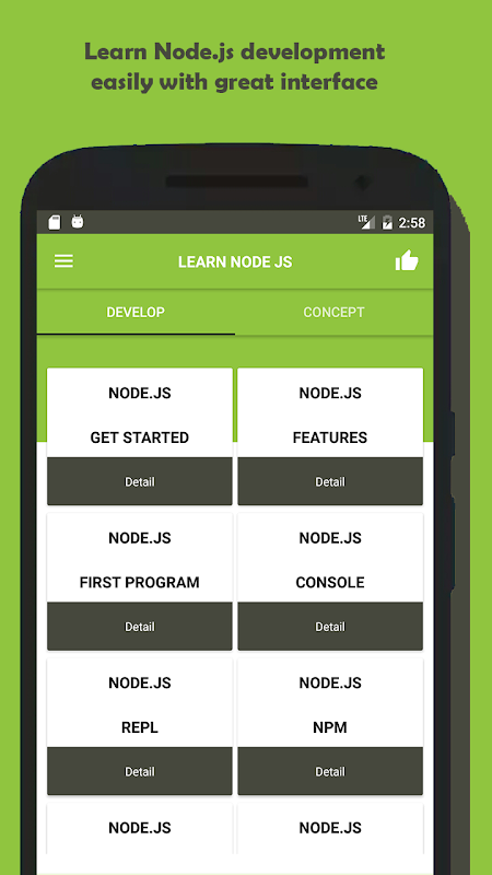 This app helps you to learn node.js easily as a guide to node js tutorial. Node.js is the most influential technologies in the Web development,we cover the basic topics as follows,