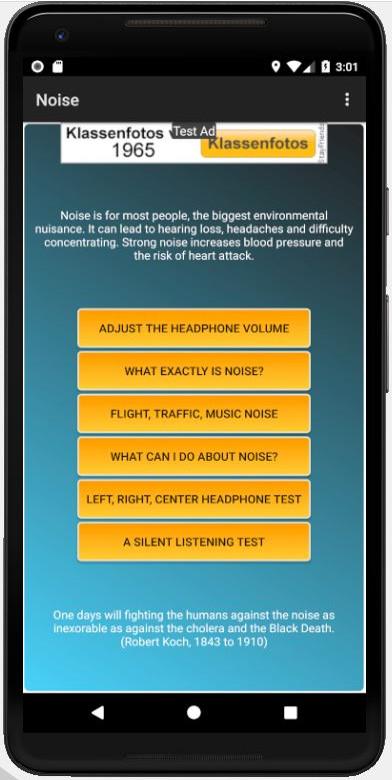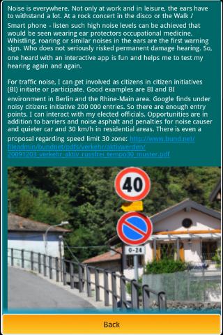 Noise affects health. Learn in a compact form in this app interesting things to noise problems. What is noise? Over millions of years mankind was surrounded only by natural sounds. Storms, lightning, falling rocks, natural eruptions were probably on the noise Scala the loudest. Waves, rustling leaves, animal sounds are perceived by us as particularly reassuring. But since the development of the steam engine and the loom, there are technical noise sources. And today, just the flight and road calls to protect against noise elaborate measures people. Most protests against the noise, there is against these types of noise. Construction noise is temporary, but traffic noise is a permanent load. Not everyone can afford or is willing to change his place of residence, to escape the permanent stress caused by noise.