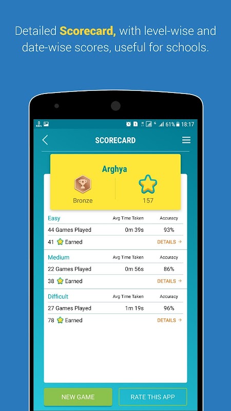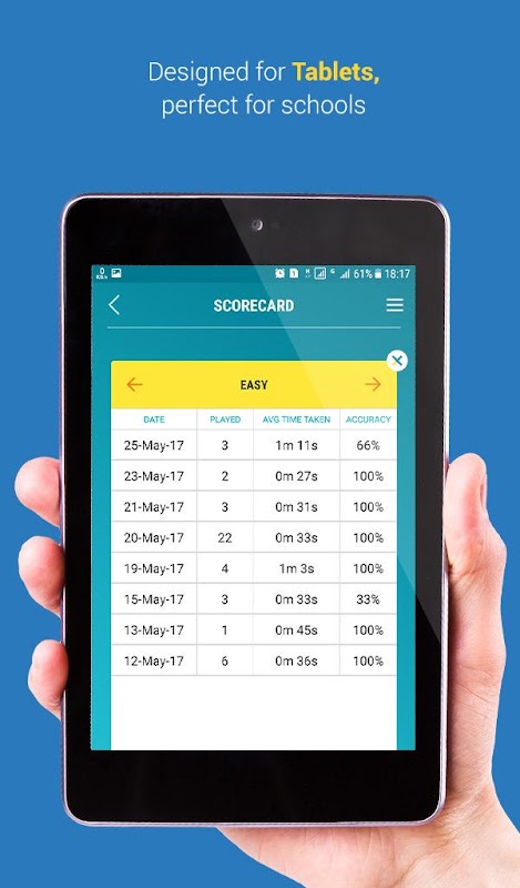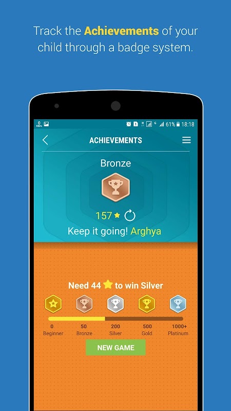 There are unlimited number of exercises. You can monitor your child’s accuracy and average time taken to solve sums in each difficulty level. The badge system (silver, gold, platinum) provides a quick preview of your child’s progress.