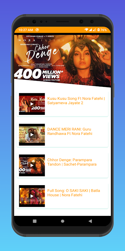 Nora's most popular song like Kusu Kusu , Dilbar Dilbar , KGF all movie song of Nora Fatehi will be available here.