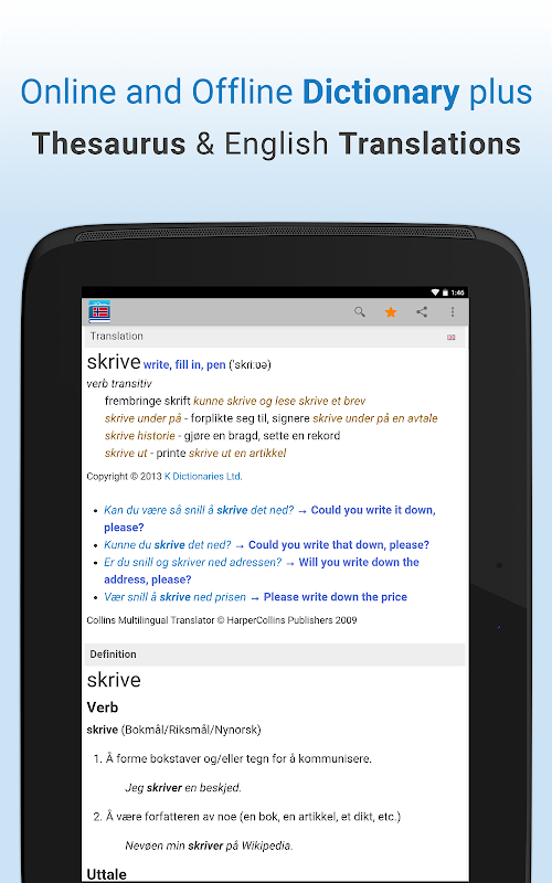* 17,000+ Norwegian definitions, all available offline! Bonus content available in online mode.