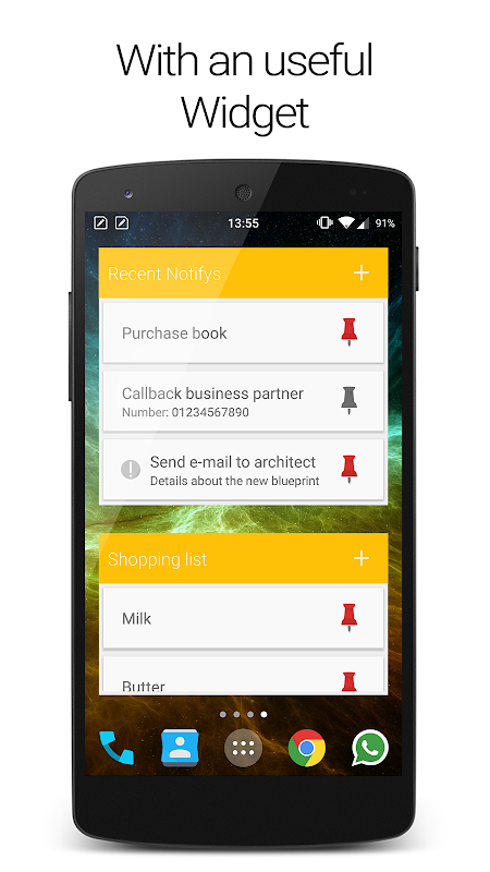 With Easy Notify you will never forget anything. A Notify is a note that reminds you of your task or any other thing. To manage your Notifys, you can easily create a new list and add new Notifys to it. Also, you can create a widget on your homescreen to add and manage your notes easily. Notifys can be sticked to your notification bar, so you have alwasy a look at your memos. The App has also a nice speech to text function, contains no ads and is free forever.