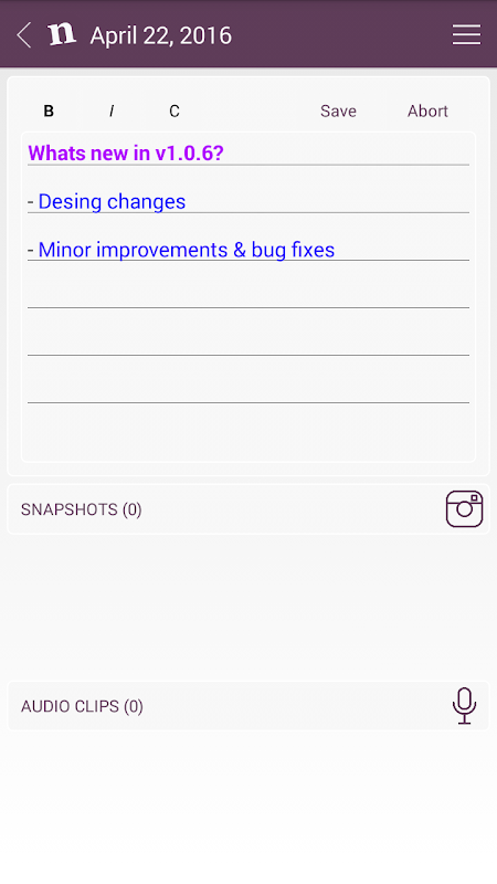 Notebook is a password protected app that saves your notes, or anything you want to organize or remember. Type notes, record audio or take a picture and Notebook saves it.