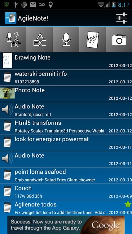 AgileNote! Beta is a multi-input notepad for Android 3+ that enables users to quickly take notes with many different input methods. You can create Voice Transcription notes, Text Notes, Audio Notes, Drawing Notes, and Photo Notes. Have a thought? Click and speak your idea to AgileNote! and have it transcribed to text. Need to draw something? Click and start drawing immediately. Think of some funny jokes? Click the text button and jot it down.