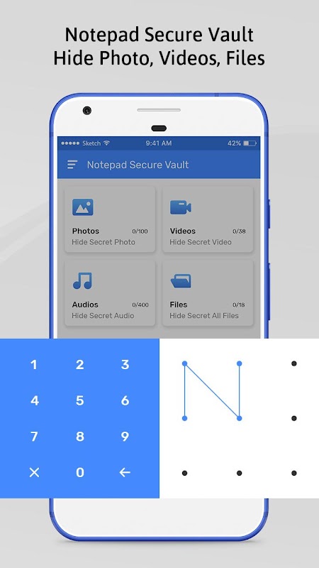 - This notepad vault provides separate places to hide photos, videos, audios, and files.
