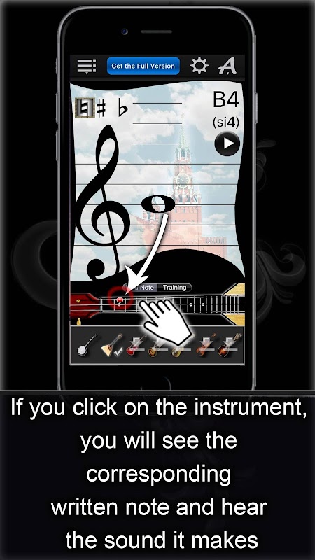 When you point to a note on a virtual page, the app will show you where this note is on an instrument and the other way around, if you click instrument, you will see the corresponding note and hear the sound it makes.