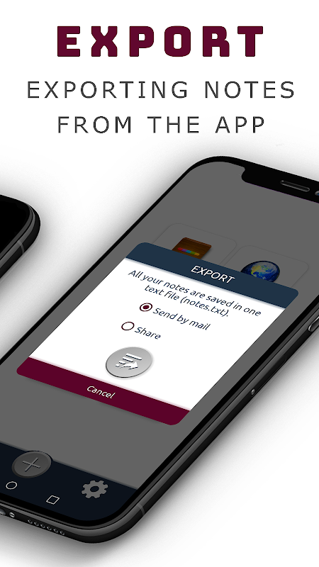 All notes can be exported / copied to your device at any time or sent as a single text file by mail or to another application. Therefore, in case of loss of the phone or failure in the device, your entries will be saved.
