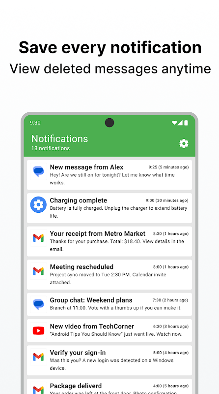 Never miss a notification with Norg, your complete notification history manager. Automatically save notifications, read messages without triggering read receipts, and view deleted messages privately. Everything stays on your device.