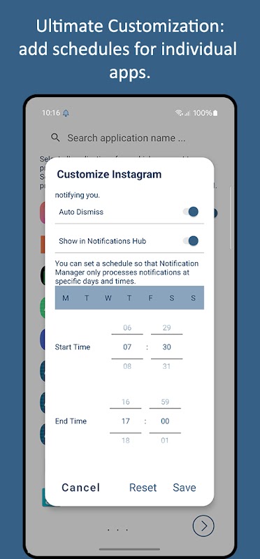 ✅ Schedules: Set timeframes for when Notification Manager should intercept or bypass notifications to the device.