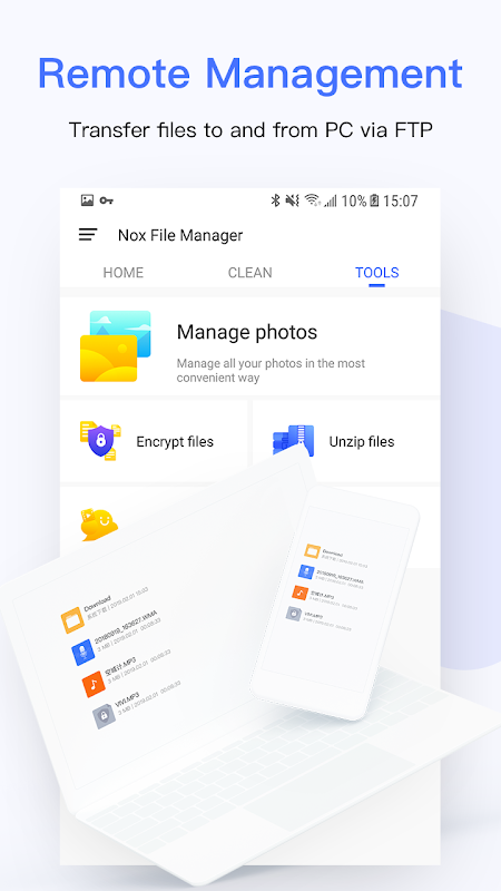 Nox File Manager can access to all files and folders on your Android devices. Users can work with phone files in a similar way with PC like browsing, copying, pasting, deleting, moving and renaming. Files in internal phone storage and SD card are supported. The user may also browse files by categories, such as Images, Audios, Videos, Apps, Documents and Downloads. Nox File Manager also help you sort your files and folders by categories and properties automatically!
