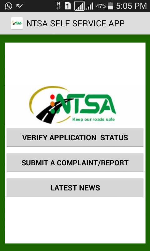 Welcome to the NTSA SELF-SERVICE APP. Using the app, you can now be able to perform all the enquiries regarding the validity of various compliances status in the transport sector.
