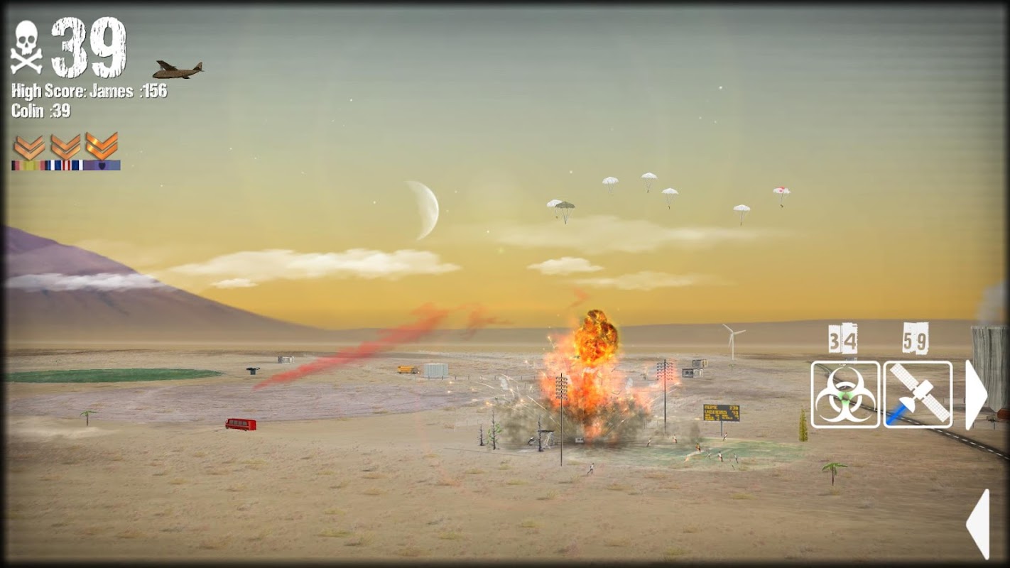 Your mission is to destroy Everything scattered across the landscape! Kill everyone on the TOP SECRET hit-list, which is updated month to month! Drop Nukes to wipeout a larger area and become an accurate bomber to kill and cross off people on your most wanted list! You can also rescue some VIP commandos scattered across the desert...