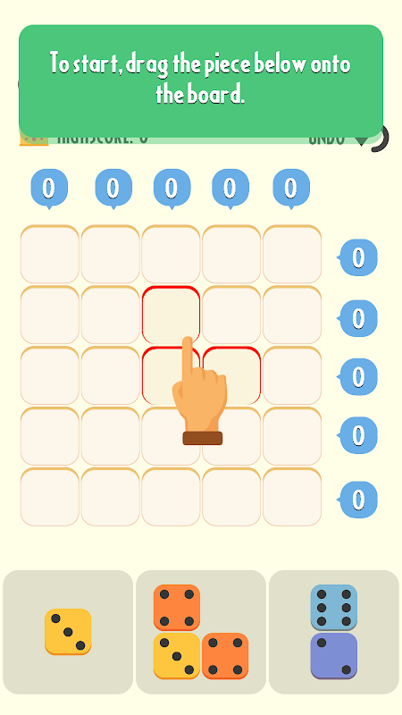 Just drag and drop the dice tiles to the grid. Our goal is create total 10 in any columns or rows. For example, 6 and 4 with be merged to 10, 4 and 4 and 2 will also be merged to 10.