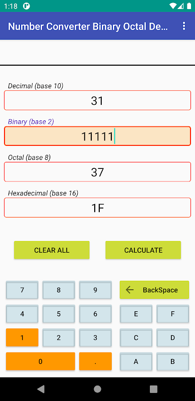As the name suggested, this is a number system base converter app. Conver number between Binary, Octal, Decimal and Hexadecimal. This is very easy straight forward app.