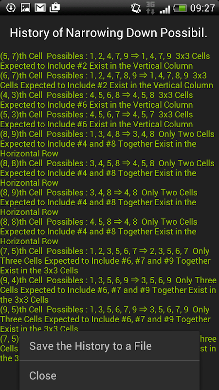 If you long tap outside of the puzzle in this level, "History of Narrowing Down Possibility" is shown and you can save it to a file.