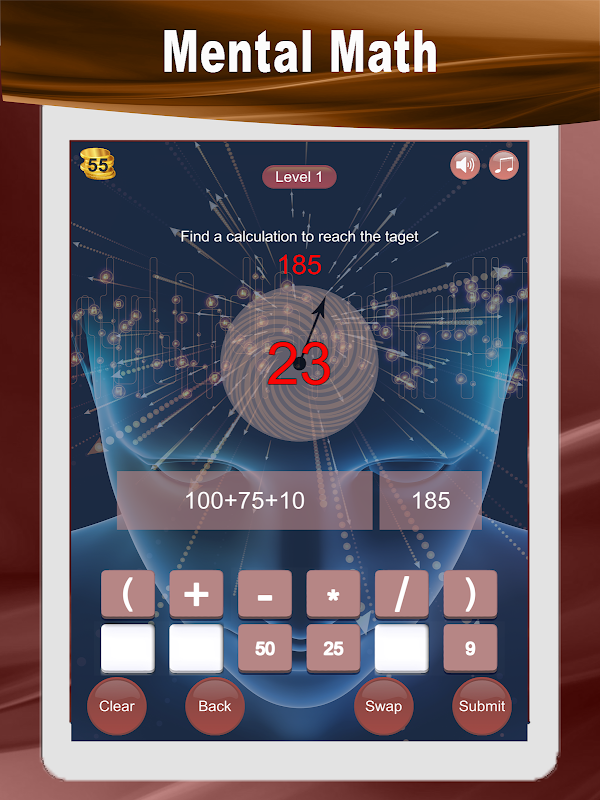 Number Scramble - Mental Math, Play this Scramble Numbers Game to find the calculation and improve your problem-solving skills. Keep your brain ticking over. Fun to play and educational. Become a mental math master! Foster a love of number. Number Scramble makes maths fun. Download Numbers Scramble - Mental Math for free and try it out. The aim of the game is to find a given number. This is a randomly generated number. You are then given six scrambled numbers and using add, subtract, multiply, divide and brackets you have to find the calculation to reach the target number. An example is shown here. Target number is 961 Given numbers are 100, 75, 9,8,7,6 and you can use ( * / + -) brackets, multiply, divide add and subtract. You do not have to use all the numbers. One answer is (100*9) + 75 – 8 – 6 =961 There are five levels for you to play so you can chart your progress. Level one is a simple way to start but you must achieve a certain percentage to advance to the next level. If you are feeling confident you can start at a more advance level. Basically this app improves your mental math and problem solving skills. There are daily challenges and a leader board so you can match your skills against others all around the world. Stimulating your brain with this mental challenge number scramble keeps you ahead of the game. Knowing your tables and remembering things you were taught at school will help. You need to know the order of mathematical operations (BODMAS or PEMDAS) but we have a crash course to help you remember this. Try it and give yourself a challenge and be proud of what you can achieve. Download Number Scramble - Mental Math today!!