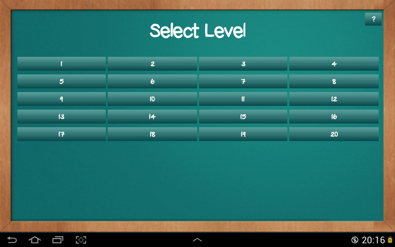 The difficulty of the levels is proportional to the number of selected level. It starts from the easiest level (level 1) to the hardest (level 20).