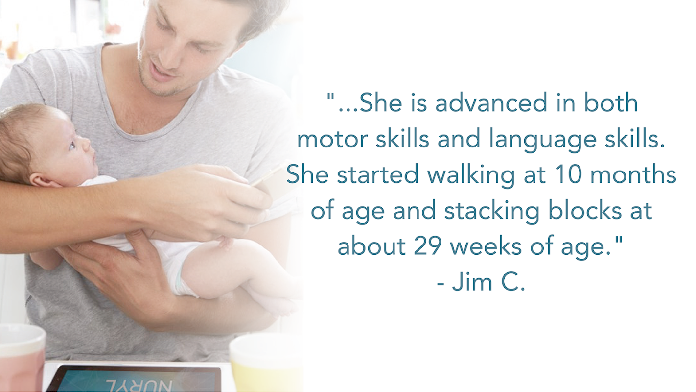 "I can say (and our pediatrician says) she is advanced in both motor skills and language skills. She started walking at 10 months of age and stacking blocks at about 29 weeks of age." - Jim C.