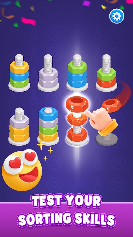 Fun nut-sorting puzzle mechanics.
