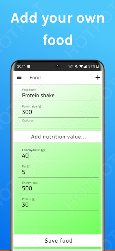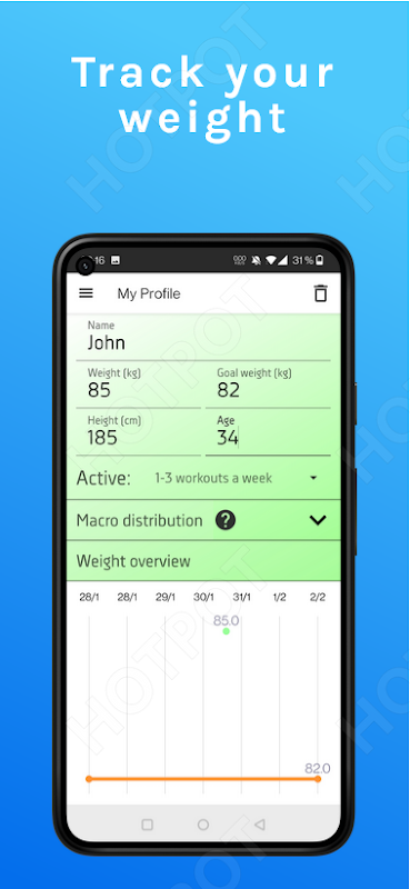 Keep track of your weight, the app gives a recommendation for your daily energy intake.