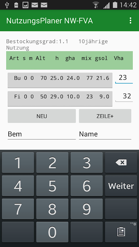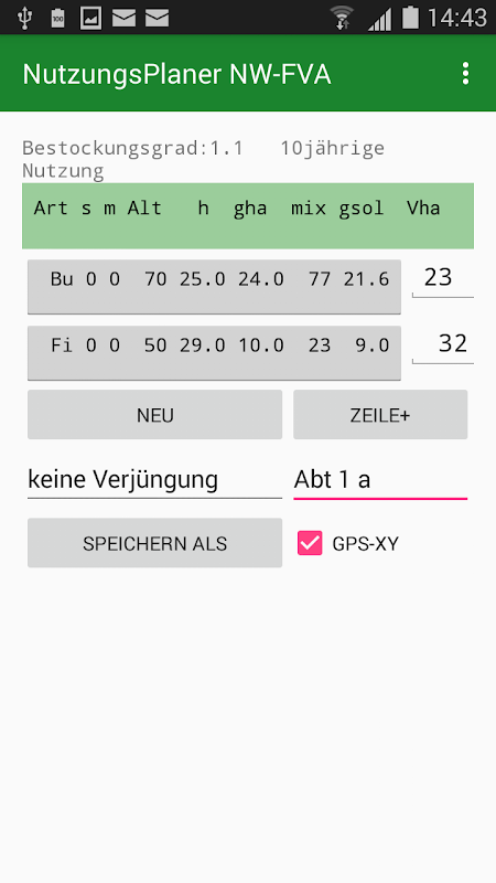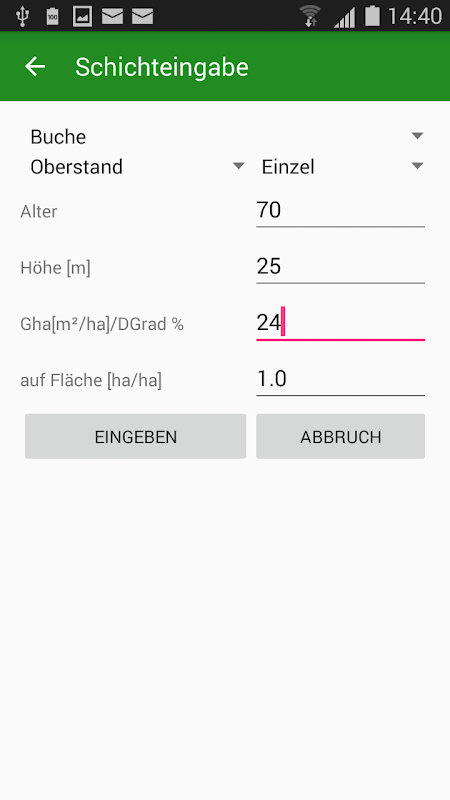 An example will illustrate the application: In a 70-year-old beech-spruce mixed stand covers an area of 24 m² / ha and a top height of 25m was measured for the beech. For spruce, the corresponding values were 10 m² / ha and 29m. First, the app user selects the button again, so that all old data will be deleted. He then presses the "Row +" and enters the mask to enter the tree species. He then enters the appropriate values. He has thereby also the possibility of the respective layer and blend shape hold. After each entry will appear on the main screen is a row for the input tree. For the missing spruce the App user repeats the process. With each new inventory line of the mixing ratio, the stocking and the proposed usage amount are recalculated. In the example, the stock has a stocking of 1.1 and it should be 47 m³ / ha beech and 29 m³ / ha Spruce be removed. The values are based on the assumption that the mixing ratio is kept constant. The user can also modify and delete, by clicking on them again entered the tree species line. Are all stock lines detected, so the proposed usage amount can either be accepted or changed interactively own estimation. The values can use the button "save as" to be stored in the SQLite database the app, which is located in the directory "/ fTools" on the sdcard named "nutzungsplaner.db". The database file can eventually be transferred to your own PC and processed with other programs via email, a cloud (Dropbox, OwnCloud) or a data cable. For the inspection and handling of SQLite file especially the free Firefox add-on SQLite Manager is recommended. With the Option button the option menu can be activated at any time, whether it be to the Help call or to end the active app.