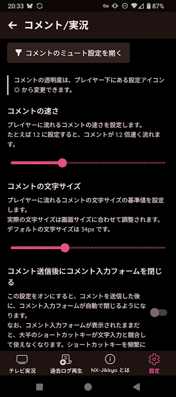 To post comments on Honke Niconico Live, you need to link with your Niconico account. You can also post comments to NX-Jikkyo's comment server by switching the comment posting destination in the settings (no login required).