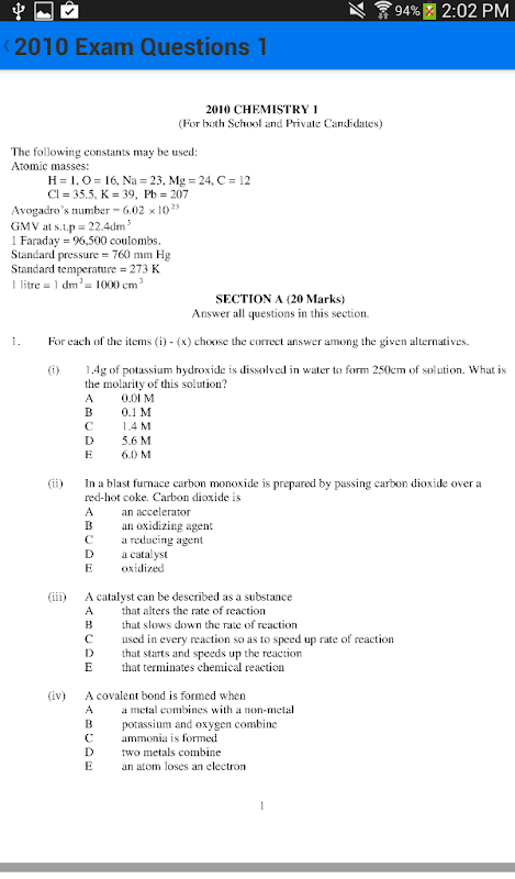 "O-Level Chemistry" application is a collection of chemistry questions from national exams from 2013-1995. This app provides availability of chemistry national exams to all students on their mobile devices (tablets, smartphones). Students can now use this app to practice to solve national exams related problems that are most likely to be encountered in O-level secondary school exams.