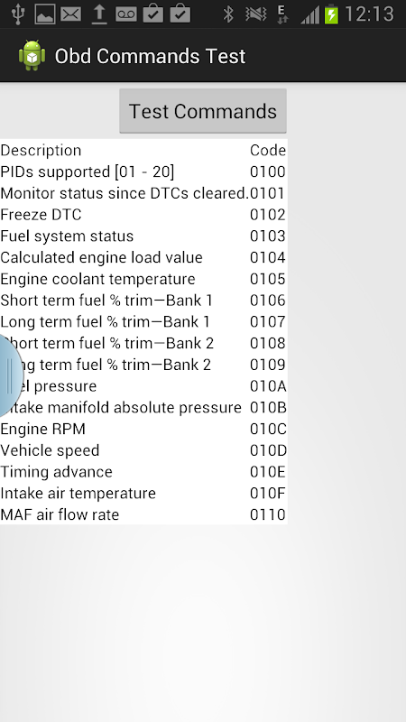 This app is designed for OBD developers and car manufacturers, and test the possible commands in a car based on the list faound at http://en.wikipedia.org/wiki/OBD-II_PIDs