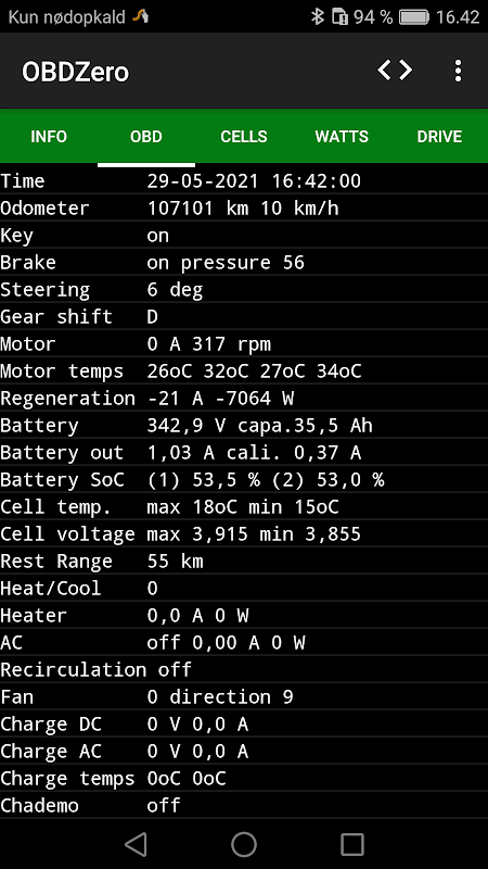 OBDZero reads, displays and stores data from the iMiev, CZero and iOn electric cars. The data such as speed and electricity use are available on the car’s CAN computer network via a Bluetooth dongle attached to the car’s OBD port. OBDZero presents this data in 14 different screens. A 15th screens logs messages between the app, the OBD dongle and the car. Six screens are intended for use while driving. These are: