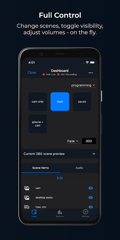 DISCLAIMER: This app is not in any way affiliated with OBS (Open Broadcaster Software). It's an unofficial, free and open source app to control OBS (https://github.com/Kounex/obs_blade)