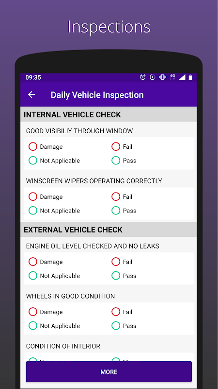 - Perform vehicle inspections*, record damage faults, notifications sent to the fleet manager