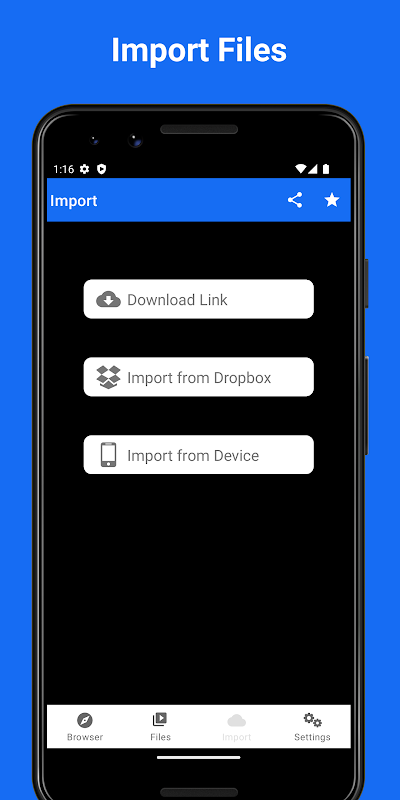Advanced Files and Download Manager, Web Browser, Media Player and Docs viewer.