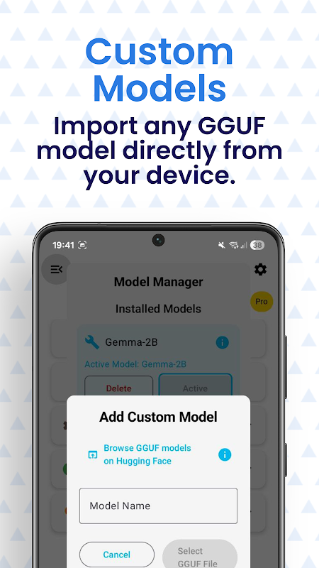 All models run 100% on-device. You can also load custom GGUF models from Hugging Face.