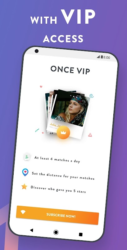 🥇 Becomes a VIP and get 3 more singles every day, picked from the most active singles. Set the maximum distance for your matches and enjoy other VIP exclusive features.