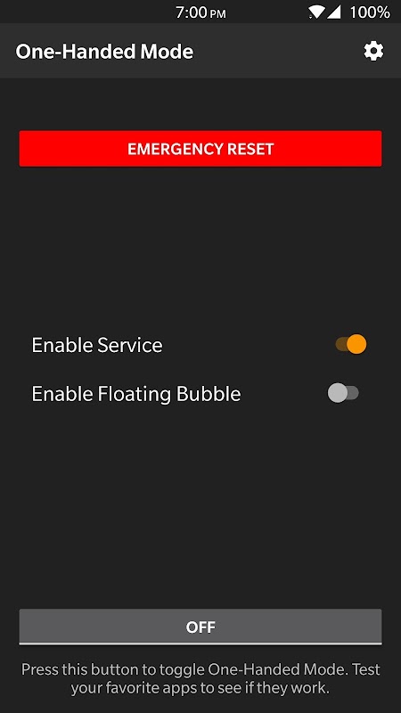 This app uses a floating, movable bubble that toggles One-Handed Mode whenever it is pressed. There are also other ways to toggle One-Handed Mode if you dislike the bubble.