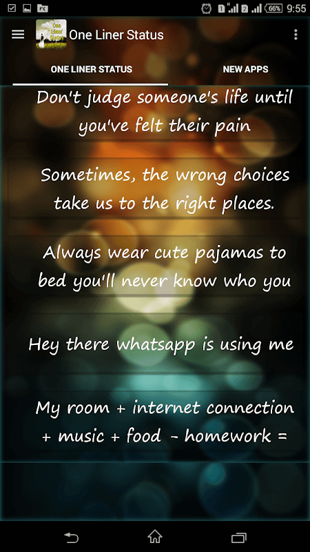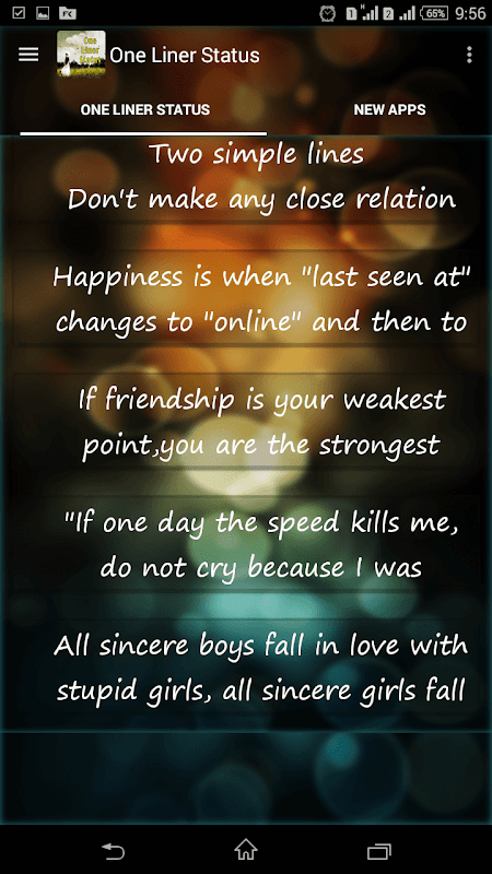 This app for Hindi English Status Messages Lover. You can share various one liner short status feeling with girlfriend,boy , loved one etc and shared to friends.These app contains short messages in english as well as Hindi .In future Sms,jokes features will be added.