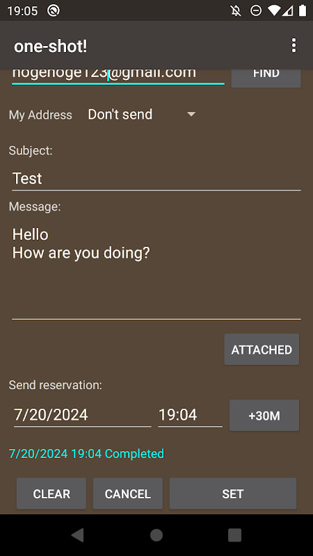 One-shot! is a convenient email app, but scheduled transmissions are done on your device, so you won't be able to send them if your device is turned off or there is no signal. Also, please note that sending may fail due to the system environment or the recipient's refusal to receive the email.