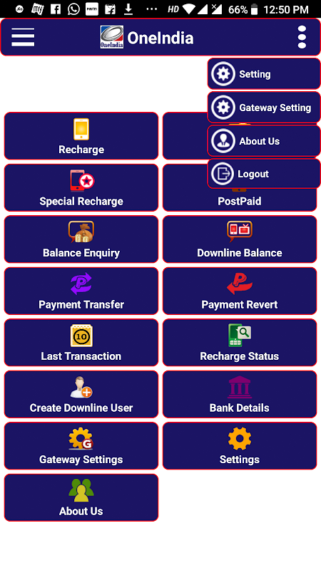 Balance check, Payment transfer, Transaction report, Search recharge by MobileNo/AccountNo